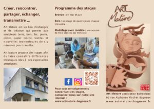 Art Mature est un lieu d’échanges et de création qui permet aux sculpteurs terre, bois, fer, pierre, plâtre, papier mâché, textiles et nouvelles technologies de s’y retrouver pour travailler.