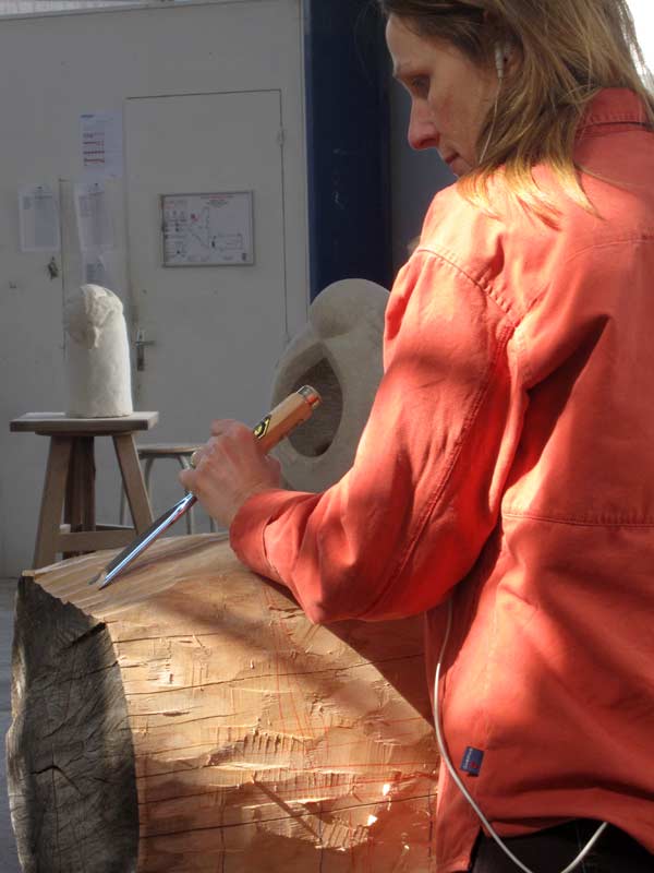 La sculpture sur bois se fait par taille directe, en tirant parti du fil du bois et de son veinage. Ceci implique un aller-retour entre le projet de l’artiste et les particularités de la pièce de bois travaillée.